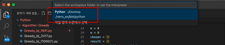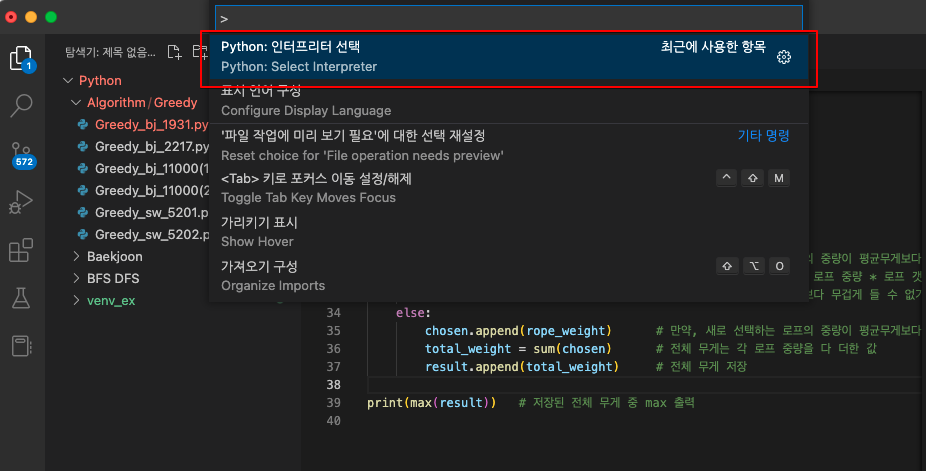 Command + Shoft + P 를 입력하여 Python 인터프리터 선택이 가능하다.