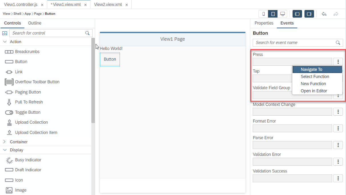 이동 버튼 클릭 시, 어디로 이동 하는지 설정해줘야 한다. 해당 버튼 위에서 생성한 View2로 이동하게 설정해보자. 해당 버튼을 누르고 우측 설정 창 중 Event > Press > Navigate to 항목을 설정해주면 된다.