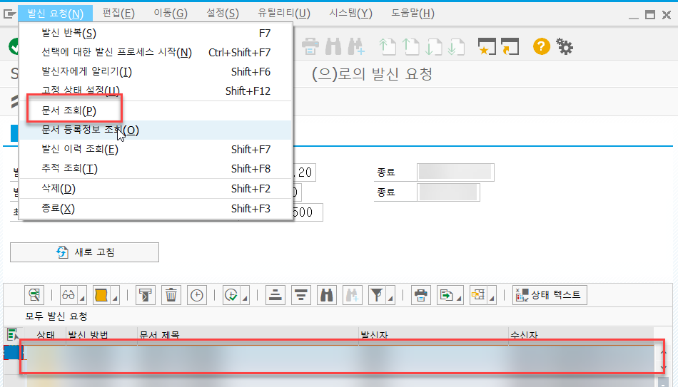 발송 대기 또는 완료된 메일이 어떻게 작성되었는지 확인하고자 한다면, 하나의 항목을 선택하고 상단의 발신요청 > 문서조회 항목을 통해 가능하다.