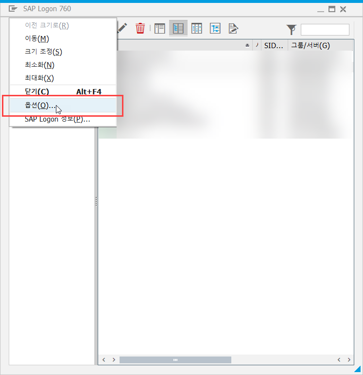 해당 창이 뜨지 않게 설정하려면, SAP GUI 창에서 아래 옵션 설정으로 들어간다.
