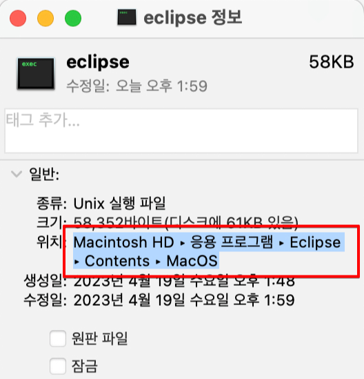 - Finder > 응용 프로그램 > (이클립스 우클릭) 패키지 내용 보기 > Contents > MacOS > (이클립스 우클릭) 정보 가져오기 > 위치 정보 복사