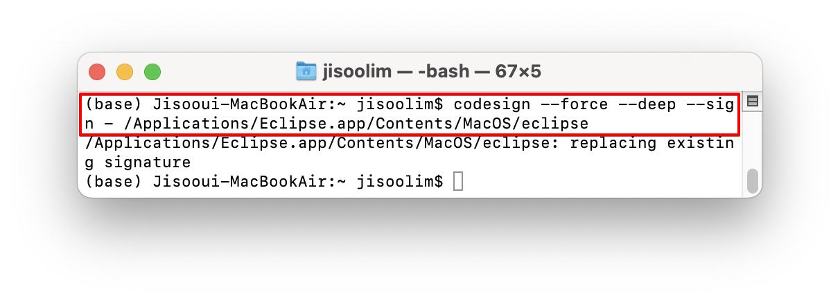 터미널을 열어서 아래 코드를 입력하고 그 뒤에 위에서 복사한 경로를 넣어 설정해준다. 그 후에 이클립스를 실행하면 오류 없이 잘 실행된다. 중요한 것은 아래 코드 입력시, 마지막 '-' 뒤에 한 글자 띄고 어플리케이션 경로를 넣어줘야 한다.