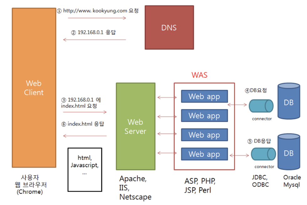 웹 동작 방식을 풀어서 보면 아래와 같으며, 한 문장으로 '요청을 보내고 응답을 받는 것'이 웹의 동작 방식이다.
