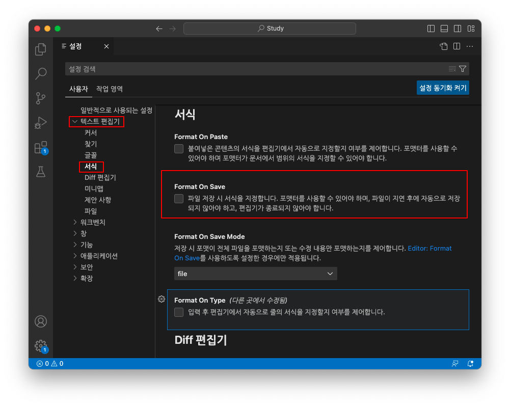 추가적으로 파일 저장 시, 자동 포맷(정렬)을 해주도록 설정할 수 있으며 언어 별로도 설정이 가능하다.