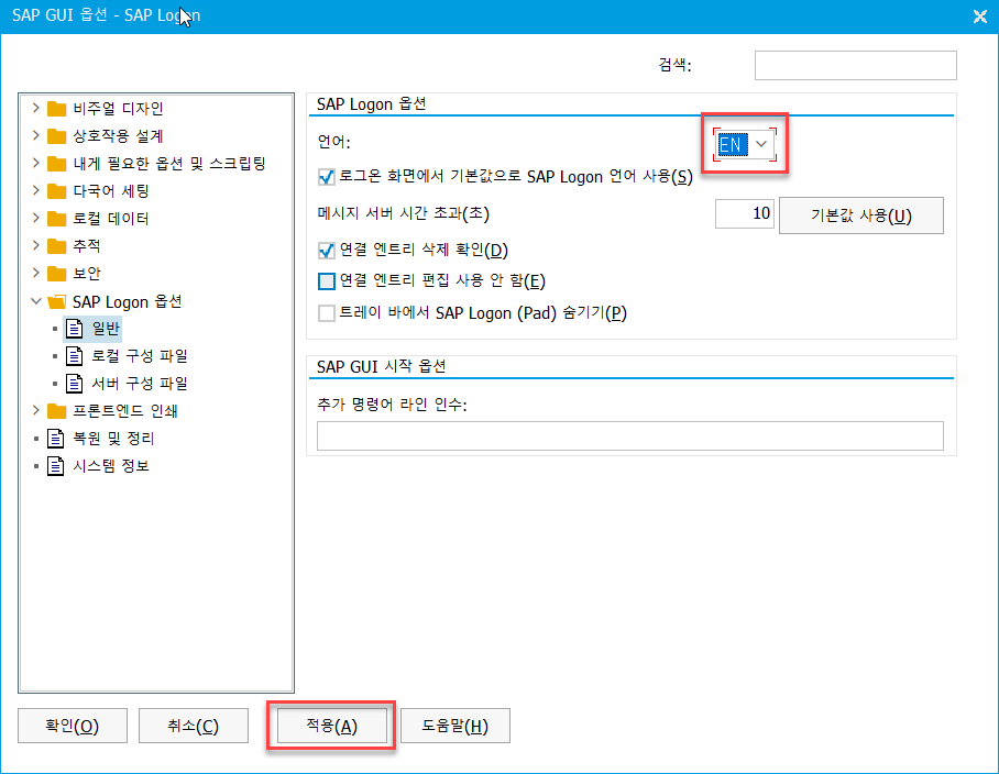- SAP Logon 옵션 > 일반 > 언어 > EN