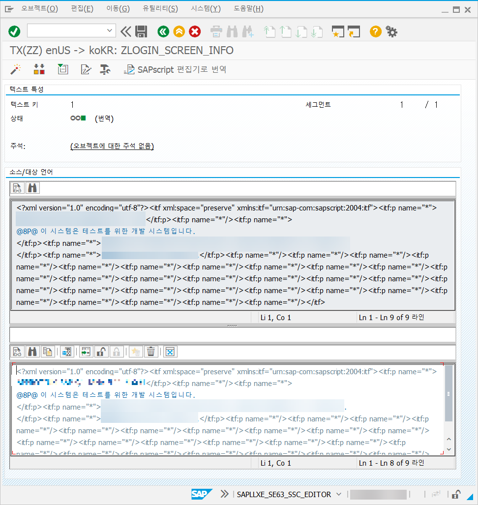 혹시 T-Code SE61에서 'ZLOGIN_SCREEN_INFO'를 각 언어별로 생성해줘야 하는 것일까 해서 추가로 생성해보기도 했지만 아래와 같은 이유로 반영되지 않았다. 그리고 다른 방법을 찾은 것이 바로 번역 수행이다.