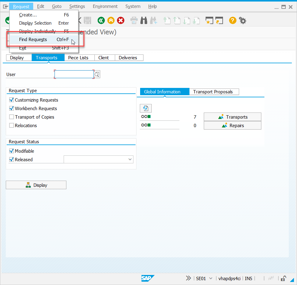 보통 본인의 CTS(Request) 항목을 볼 때, T-Code SE01 에서 조회하는데, 조회 조건을 줘서 다른 사람들의 CTS도 확인 가능하다. 우선 T-Code SE01에서 Request를 조회하는 화면으로 이동하자.