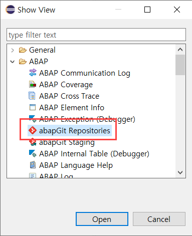 ADT ABAP 개발은 perspective를 통해 열었다면 ABAP Git은 view에서 열어준다.