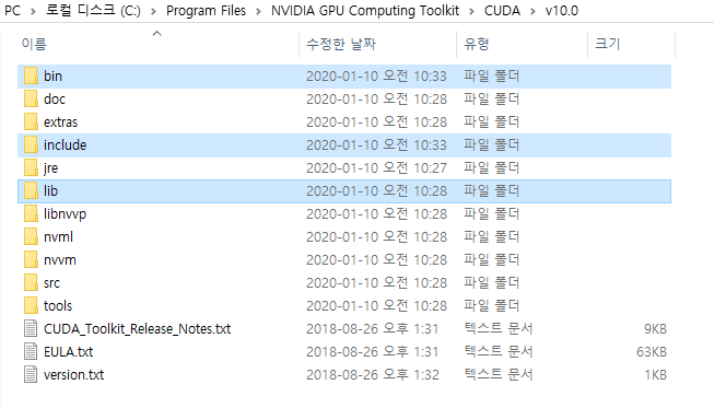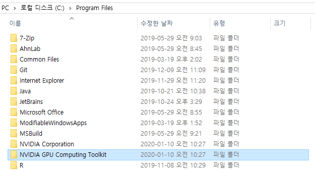 내부에 CUDA 하위 폴더와 여러 폴더가 존재한다면 설치가 온전히 된 것!