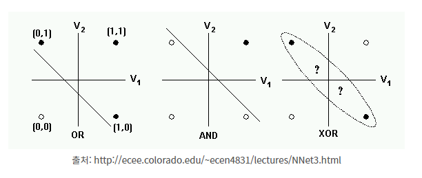 perceptron으로 AND/OR는 구현이 가능하다. 즉, 학습이 가능하다. 하지만, XOR(exclusive)는 perceptron으로 구현이 불가능하다. 즉, 학습이 불가능하다. 모든 회로를 perceptron으로 만들 수 있으면 이를 모아서 칩을 만들면 되는데, XOR 때문에 제동이 걸리게 되었다. 그 후, 많은 사람들이 XOR을 어떻게 perceptron으로 구현할 수있을지에 대해 매달리게 되었다. 그래야 각 논리회로를 학습이 가능한 perceptron으로 구현해야지 학습이 가능한 인공 신경망을 만들 수 있기 때문이다.