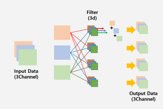 이처럼 필터의 크기는 내가 설정할 수 있지만, depth 혹 channel의 크기는 3으로 이미지와 동일한 크기여야 한다.