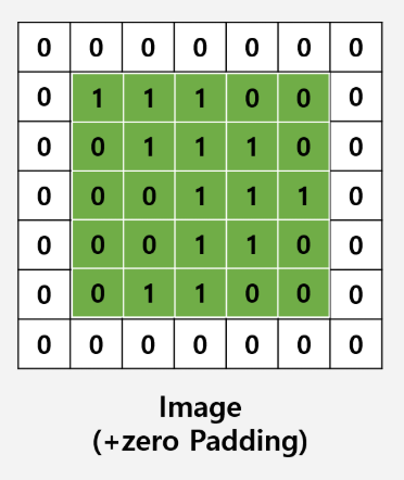 위와 같이 0으로 둘러싸는 padding을 zero padding이라고 한다. 상식적으로 생각해본다면 이미지의 주요 특징 및 요소는 중앙에 위치해 있으므로 이미지 주위에 0의 값으로 padding한다고 하여 특징에 큰 영향을 미치지 않기 때문에 가능하다. 이렇게 padding을 한다면 colvolution 과정을 실행해도 데이터 출력 값이 작아지지 않는다.