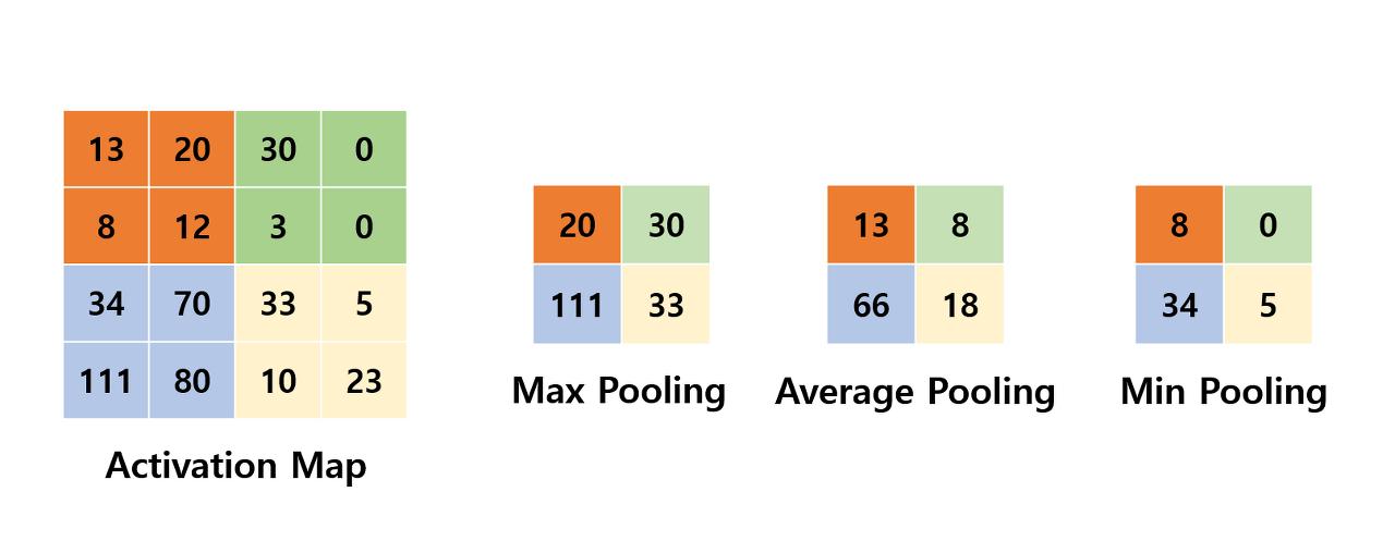 pooling layer는 최댓값을 구하거나 평균을 구하는 방식으로 동작한다. 일반적으로 pooling의 크기와 stride의 크기를 같게 설정하여 모든 원소가 한 번씩은 처리가 되도록 설정한다.