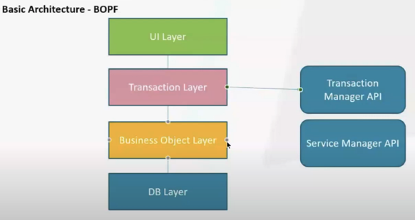 다양한 비즈니스 어플리케이션 구성요소를 원할하게 통합할 수 있는 프레임워크로 쉽게 구축할 수 있는 장점을 지닌다. 아래 이미지처럼 BOPF는 다양한 구성요소 사이에서의 징검다리 역할을 한다.