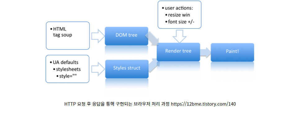 아래의 그림에서 DOM은 HTML을 파싱한 것, CSSOM은 CSS를 파싱한 것이다. 이 둘을 합쳐 Render Tree를 만든 후, Render Tree를 출력할 노드를 결정하고, 해당 노드의 스타일 값을 계산, 뷰 포트에서 노드가 가져야 할 정확한 위치와 크기를 계산 및 전부 절대값으로 paint 과정을 거쳐 화면에 출력하면 된다.