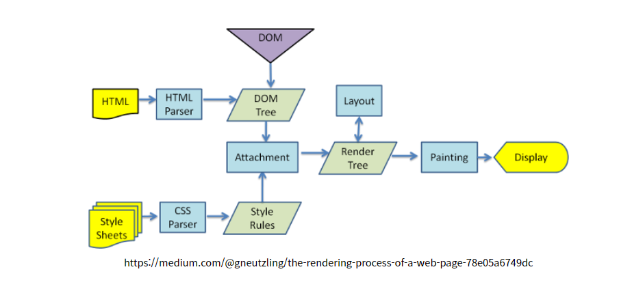 rendering의 과정은 크게 2단계를 거쳐 이루어진다. 일반적인 전체 흐름은 브라우저에 문서가 로딩 됨에 따라 DOM 트리의 구성이 진행되면, 레이아웃을 계산한 후 문서에 요소를 그린다.